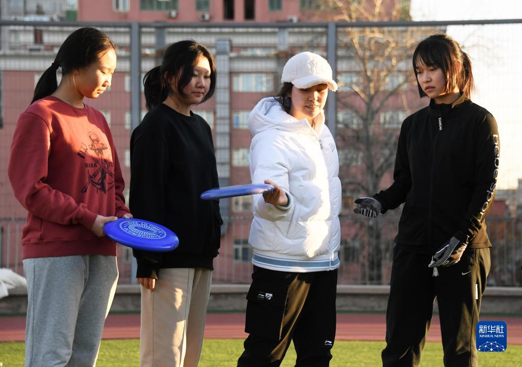 2月20日,在北京大學(xué)附屬中學(xué),體育教師王海粟(右二)在體育課中為學(xué)生進(jìn)行極限飛盤(pán)動(dòng)作指導。