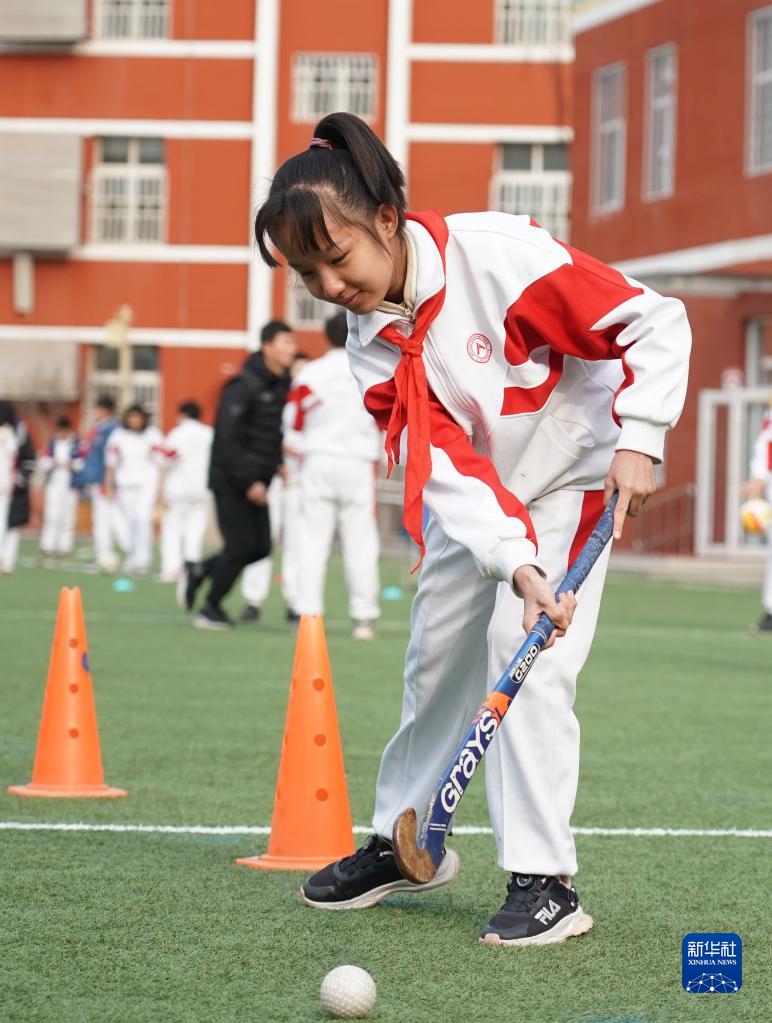 2月21日,在人大附中實(shí)驗小學(xué),學(xué)生在體育課中進(jìn)行曲棍球基本技術(shù)動(dòng)作練習。
