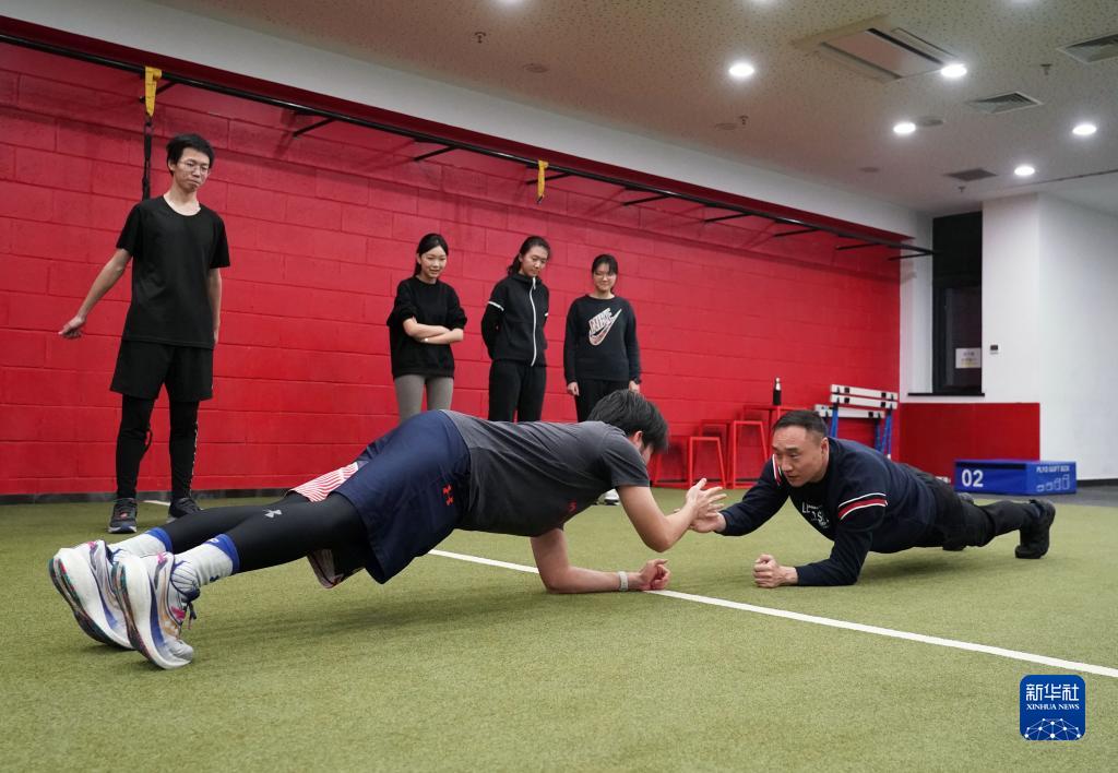2月20日,在北京大學(xué)附屬中學(xué),體育教師龐劍(右一)在體育課中指導學(xué)生進(jìn)行平板擊掌練習。