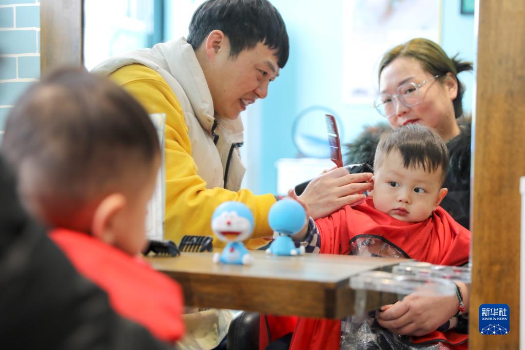 2月21日,小朋友在江蘇省淮安市洪澤區一家理發(fā)店理發(fā)。