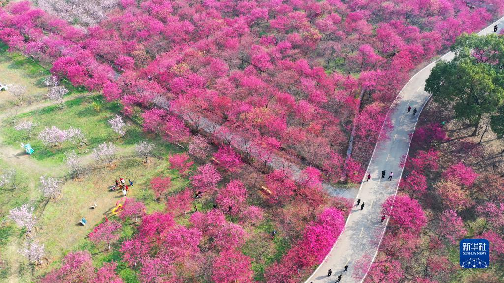 2月21日,游客在常寧市羅橋鎮廟山村櫻花園賞櫻游玩(無(wú)人機照片)。