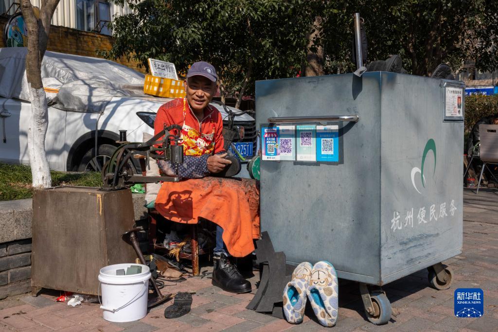2月21日,修鞋匠金榮祥在杭州市西湖區北山街道便民服務(wù)攤位修鞋。北山街道幫助轄區內6處便民服務(wù)攤位統一辦理了杭州市便民服務(wù)證,方便他們?yōu)槔铣菂^內的居民提供便民服務(wù)。