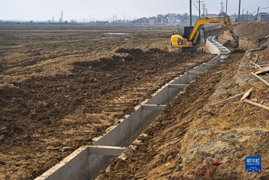 2月21日,施工人員在新建區象山鎮高標準農田建設現場(chǎng)加固灌溉渠。