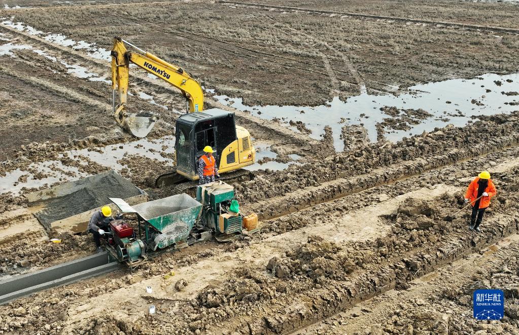 2月21日,施工人員在新建區象山鎮高標準農田建設現場(chǎng)硬化灌溉渠(無(wú)人機照片)。