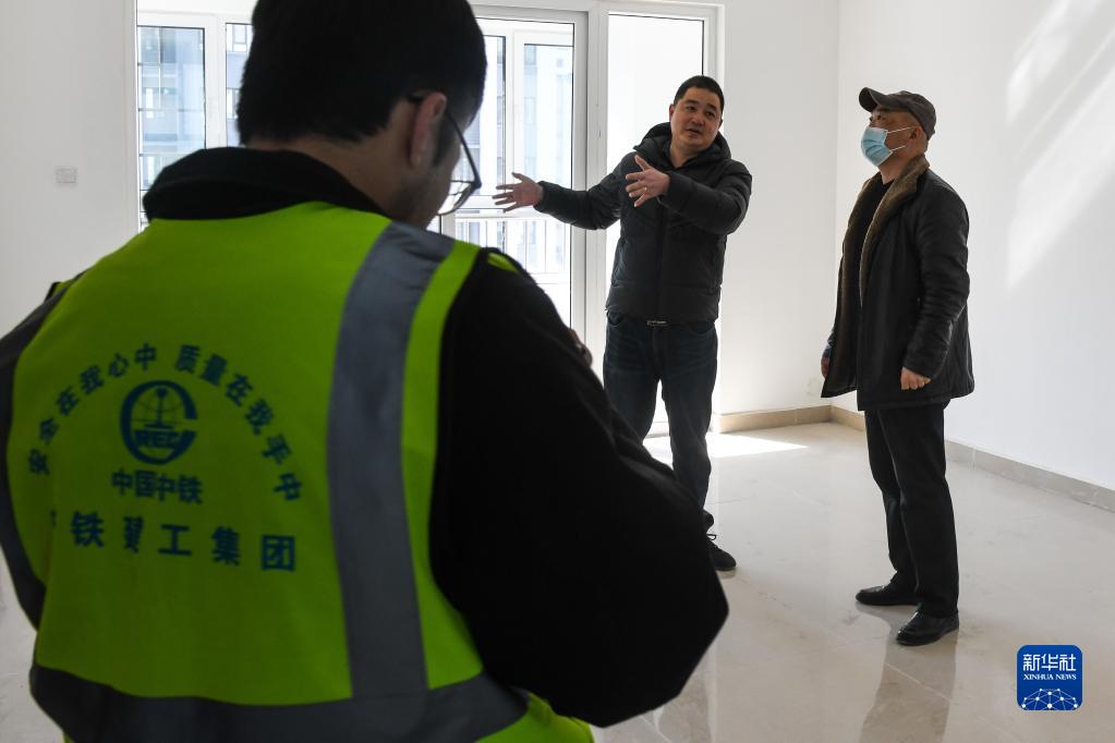 2月21日,回遷居民莊教濱(右)在中鐵建工集團技術(shù)人員陪同下驗收新居。