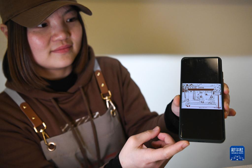 2月16日,楊倩展示客人在“8分鐘”咖啡店門(mén)前創(chuàng )作的繪畫(huà)。