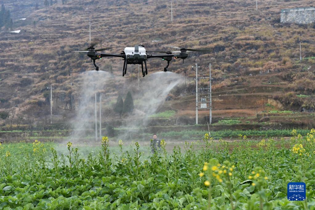 2月21日,在貴州省銅仁市松桃苗族自治縣甘龍鎮麻兔村,農戶(hù)操作無(wú)人機在田間管護油菜。