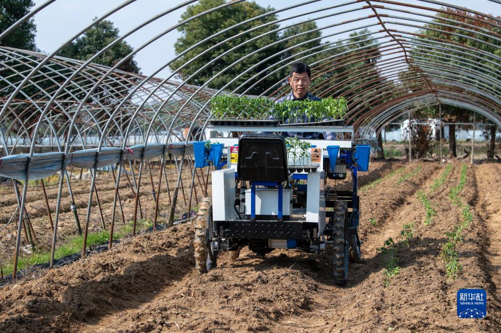 2月21日,在浙江省金華市婺城區白龍橋鎮董村辣椒基地,農民在田間操控蔬菜移栽機。