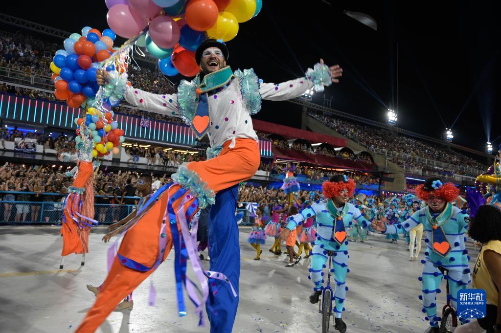 2月21日凌晨,在巴西里約熱內盧桑巴大道,一名桑巴舞校演員參加狂歡節游行。