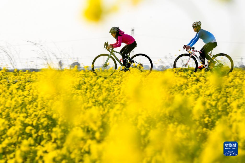2月21日,騎行愛(ài)好者在江西省樟樹(shù)市永泰鎮官湖村油菜花海中騎行、賞花。