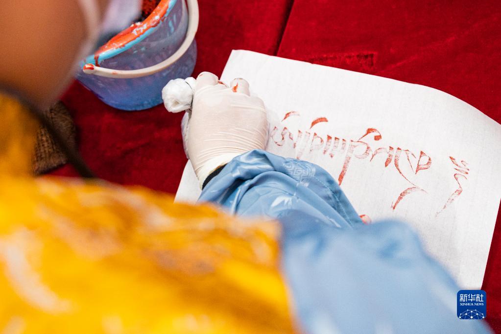 2月22日,西藏博物館工作人員將刻有“扎西德勒”的木刻印刷在紙上。