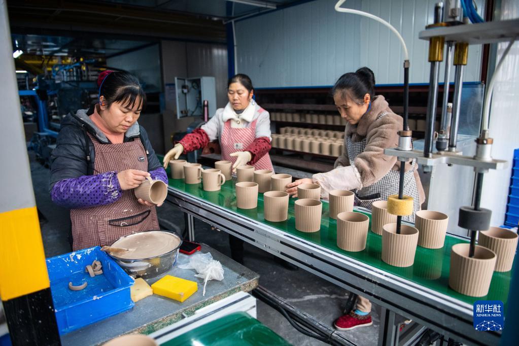 2月22日,在位于醴陵市的湖南華聯(lián)溢百利瓷業(yè)有限公司生產(chǎn)車(chē)間,工作人員在安裝瓷杯握柄。