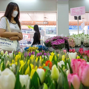 2月21日,工作人員在泰國曼谷帕空鮮花市場(chǎng)搬運來(lái)自云南的鮮花。