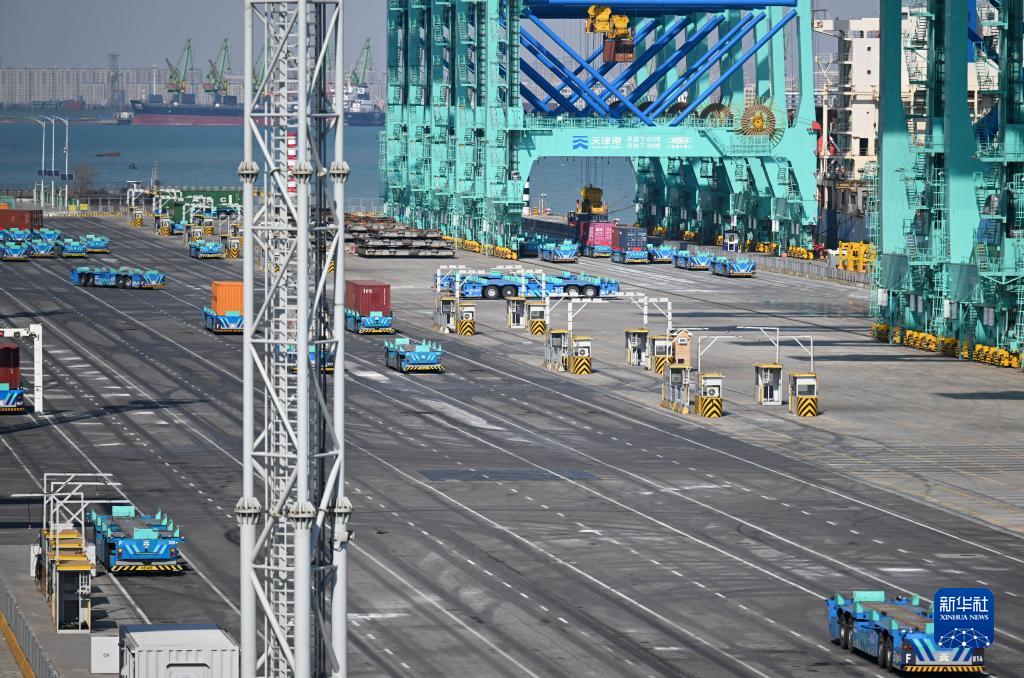 智能水平運輸機器人在天津港全物聯(lián)網(wǎng)集裝箱碼頭作業(yè)(2月21日攝)。