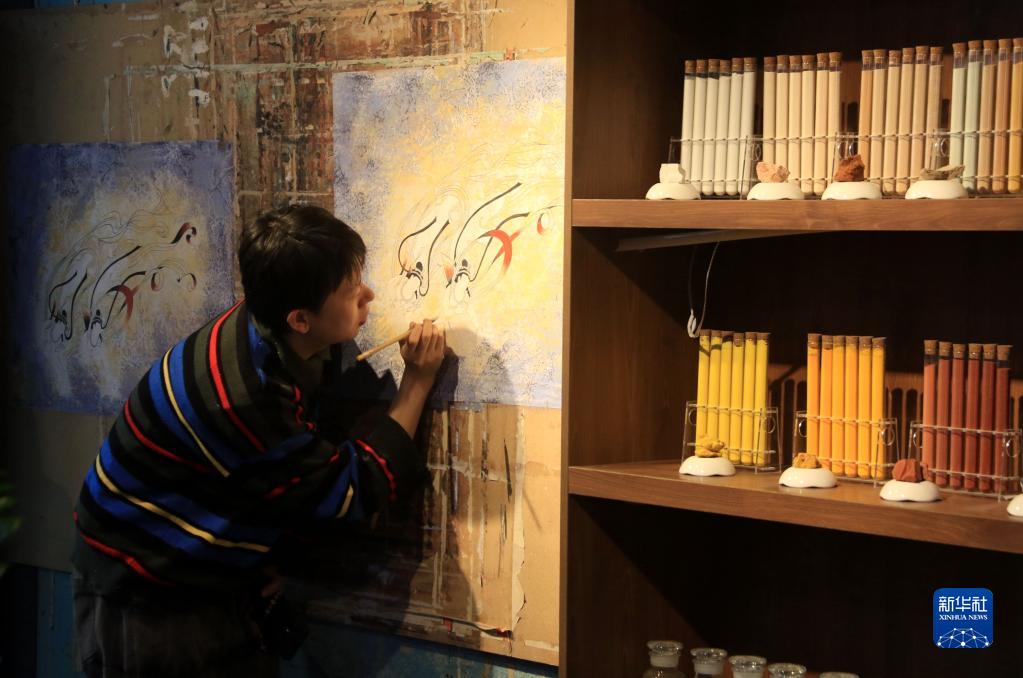 2月22日,在敦煌小鎮鳴沙書(shū)院,來(lái)自甘肅的學(xué)員朱俊峰學(xué)習敦煌壁畫(huà)臨摹技藝。