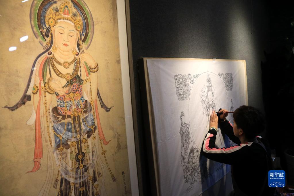 2月22日,在敦煌小鎮鳴沙書(shū)院,來(lái)自陜西的學(xué)員吳恩梵學(xué)習敦煌壁畫(huà)臨摹技藝。