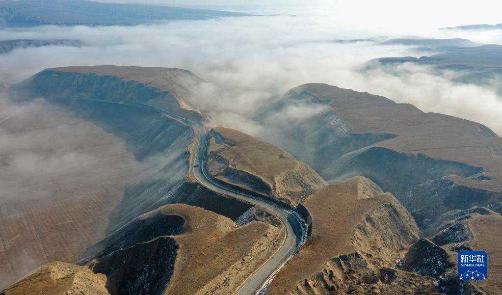 當日,寧夏吳忠市同心縣的山谷間出現云海景觀(guān),農田、旱塬、公路在霧中若隱若現,景色壯美。