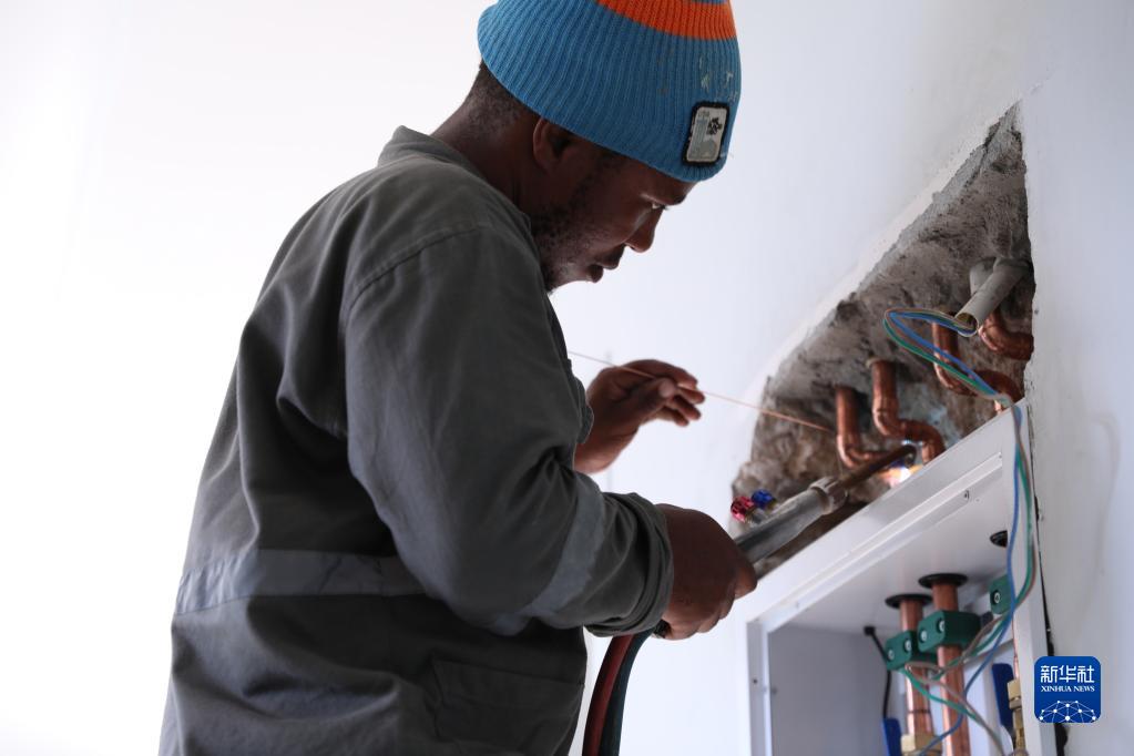 2月21日,工人在坦桑尼亞桑給巴爾島姆布茲尼地區醫院安裝醫用氧氣相關(guān)設施。
