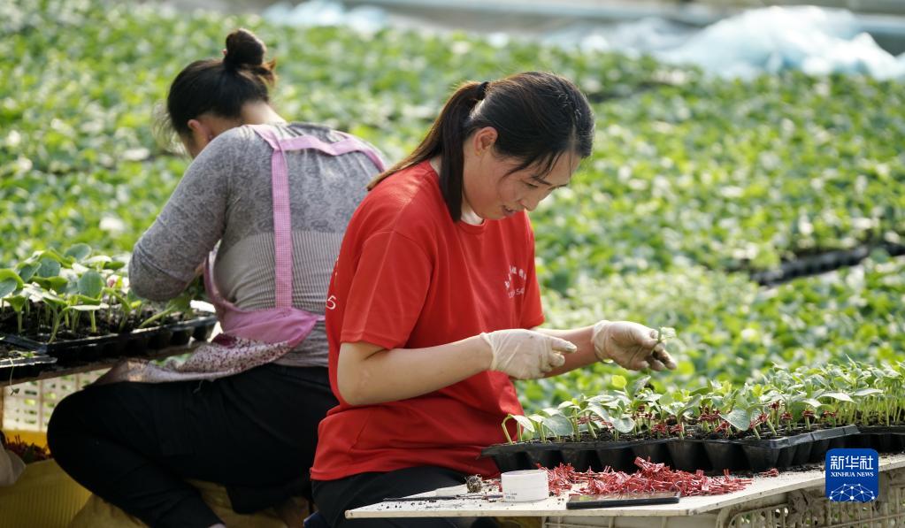 2月22日,北京市大興區龐各莊鎮一家合作社的農民在大棚內嫁接秧苗。
