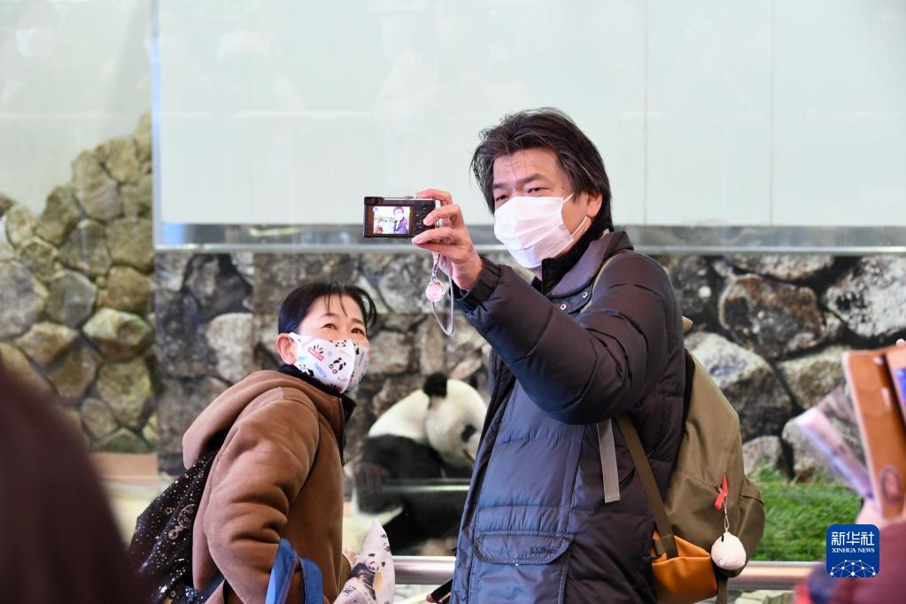 2月21日,在日本和歌山縣白浜町的“冒險世界”樂(lè )園,游客拍照留念。