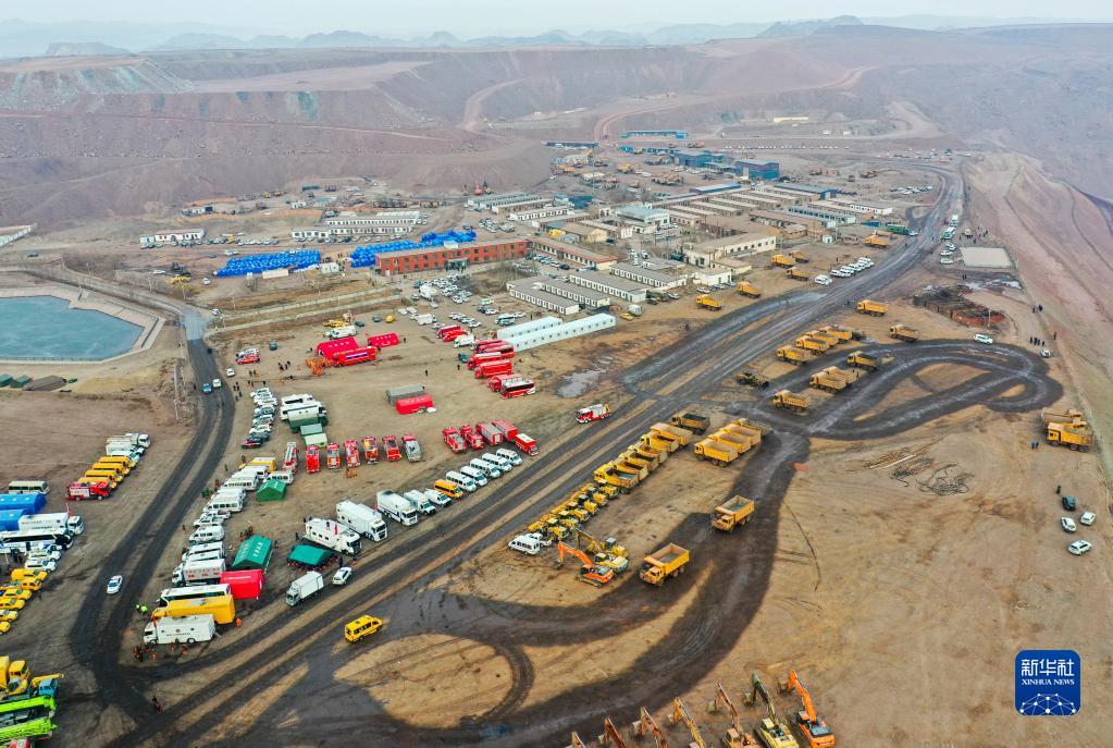 2月23日,救援車(chē)輛在內蒙古自治區阿拉善盟阿拉善左旗新井煤業(yè)有限公司露天煤礦坍塌事故現場(chǎng)附近待命(無(wú)人機照片)。