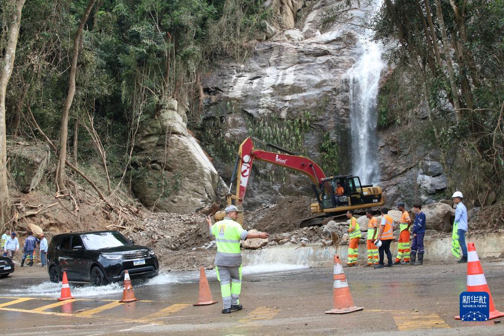 2月22日,救援人員在巴西圣保羅州圣塞巴斯蒂昂一處受損路段工作。