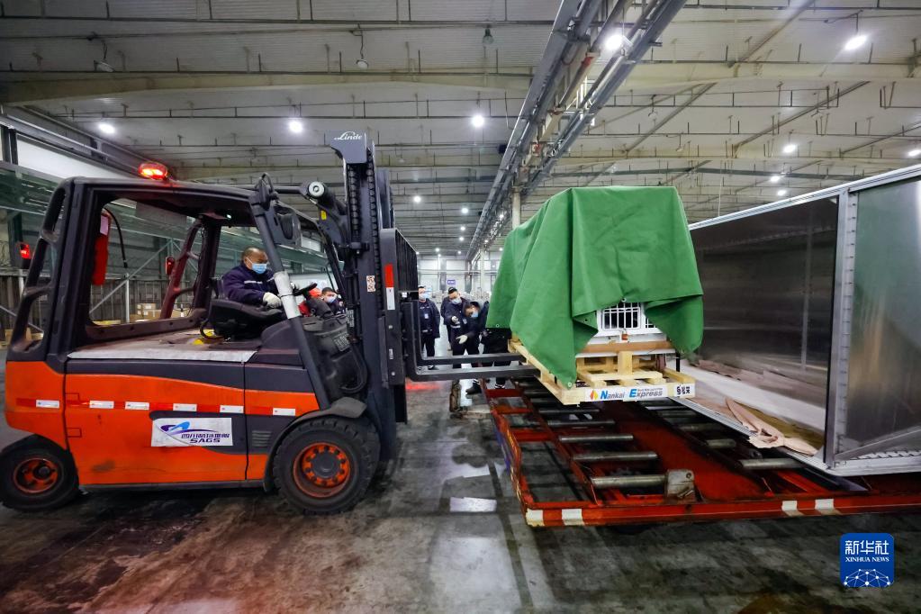 2月22日晚,在成都雙流機場(chǎng)海關(guān)的查驗區,工作人員在裝卸運抵中國的大熊貓“永明”。