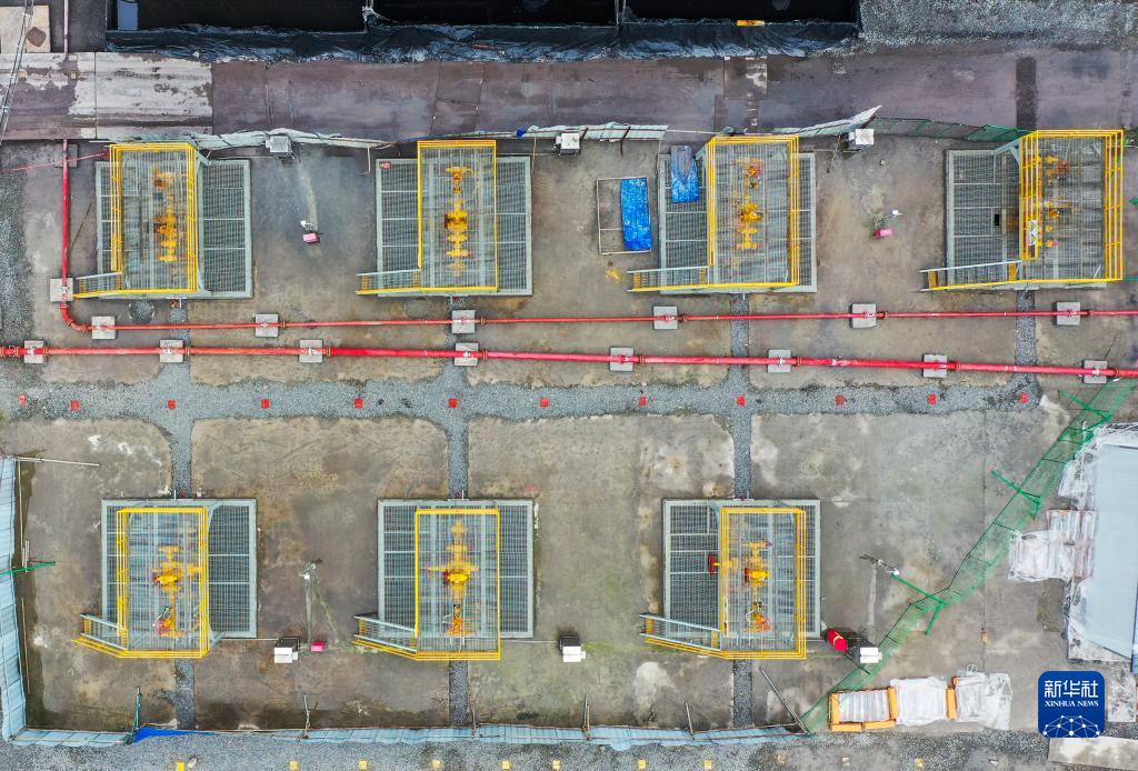 這是2月21日拍攝的涪陵頁(yè)巖氣田焦頁(yè)12號平臺正在生產(chǎn)中的頁(yè)巖氣井(無(wú)人機照片)。