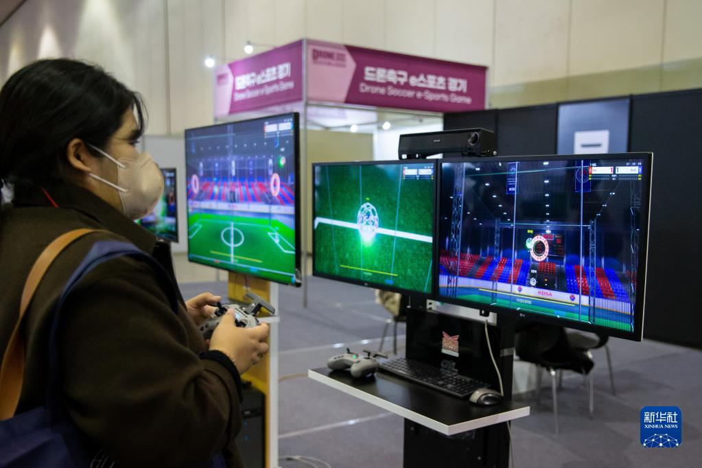 2月23日,參觀(guān)者在韓國釜山舉辦的2023韓國無(wú)人機展上體驗無(wú)人機游戲。