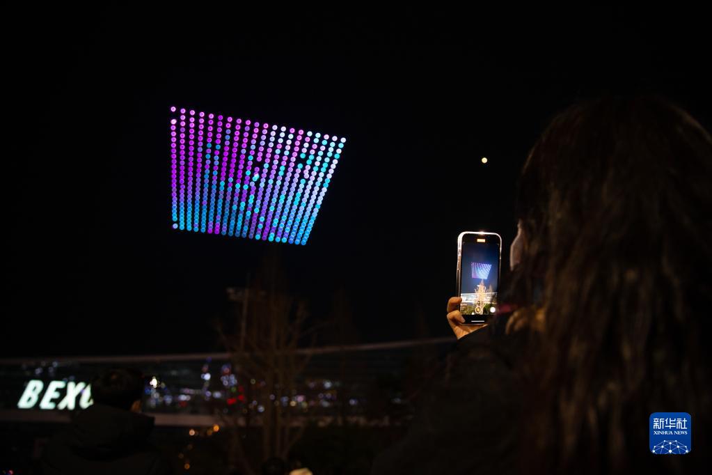 2月23日,參觀(guān)者在韓國釜山用手機拍攝2023韓國無(wú)人機展上的無(wú)人機燈光表演。