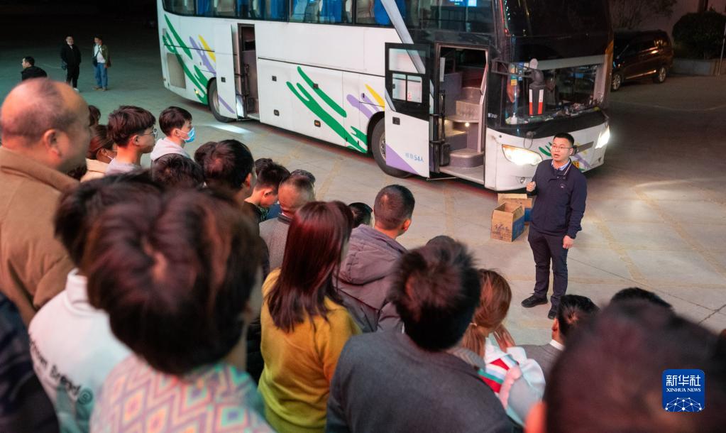 在云南省曲靖市麒麟區人力資源服務(wù)產(chǎn)業(yè)園內,袁海波給準備出發(fā)的務(wù)工人員加油鼓勁(2月12日攝)。