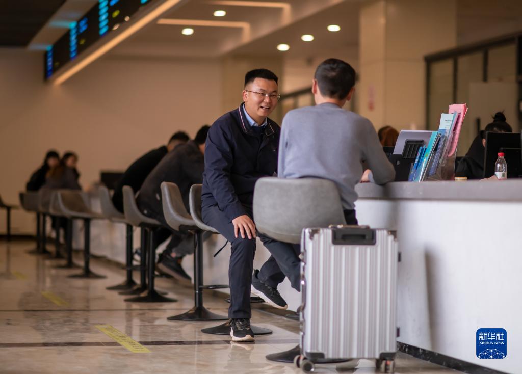 在云南省曲靖市麒麟區人力資源服務(wù)產(chǎn)業(yè)園,袁海波(左)向準備出發(fā)的務(wù)工人員了解就業(yè)需求(2月11日攝)。