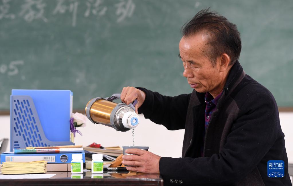 在廣西賓陽(yáng)縣王靈鎮中心學(xué)校七新教學(xué)點(diǎn),王英紅老師倒水準備吃藥(2月22日攝)。