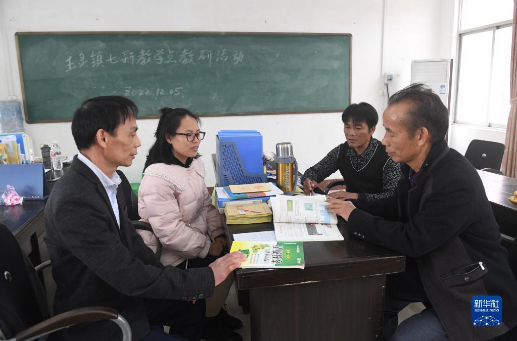 在廣西賓陽(yáng)縣王靈鎮中心學(xué)校七新教學(xué)點(diǎn),王英紅老師(右一)和同事一起探討教學(xué)方法(2月22日攝)。