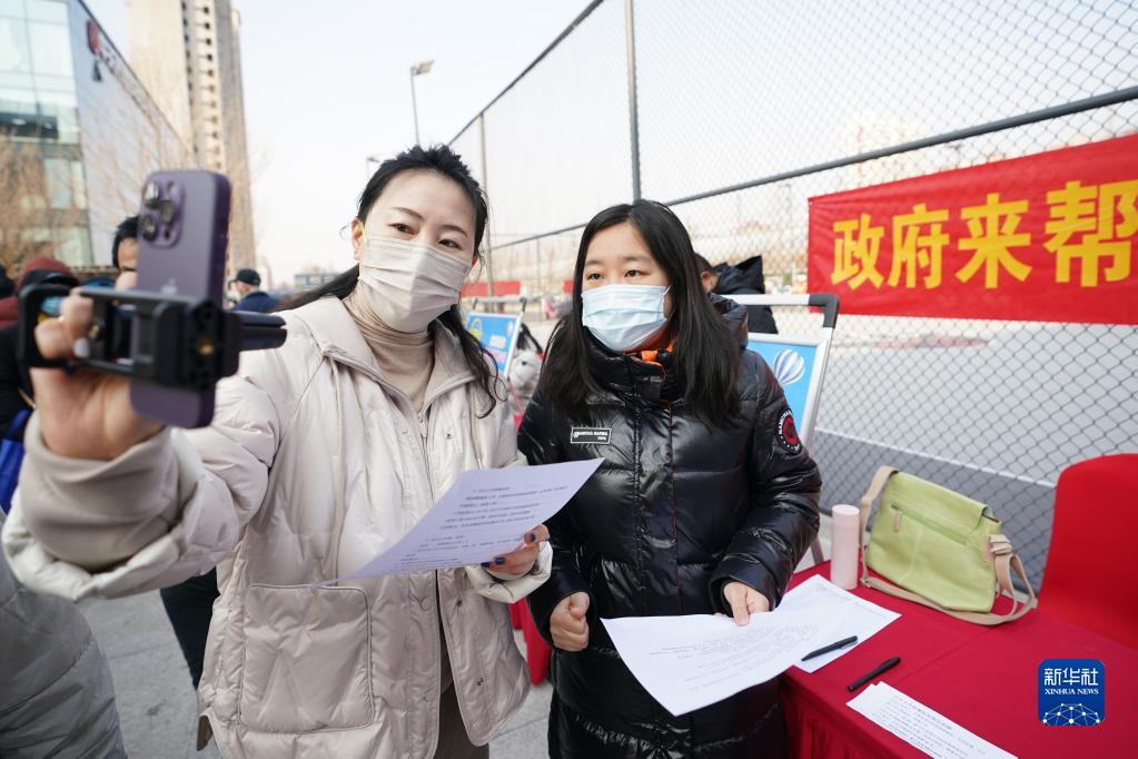 在北京市石景山區八寶山街道的復工復產(chǎn)招聘會(huì )上,石景山區人力資源公共服務(wù)中心職業(yè)指導師馬建穎(左)在現場(chǎng)直播帶崗,介紹企業(yè)崗位信息(2月22日攝)。