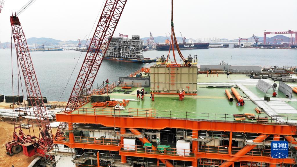這是正在建造中的渤中19-6凝析氣田一期CEPA(中心處理平臺)組塊(2月22日,無(wú)人機照片)。