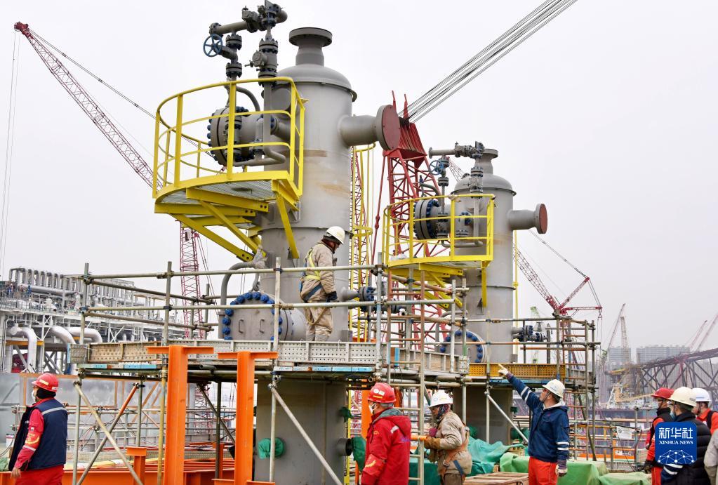 2月22日,工人在渤中19-6凝析氣田一期CEPA(中心處理平臺)組塊建造現場(chǎng)進(jìn)行安裝作業(yè)。