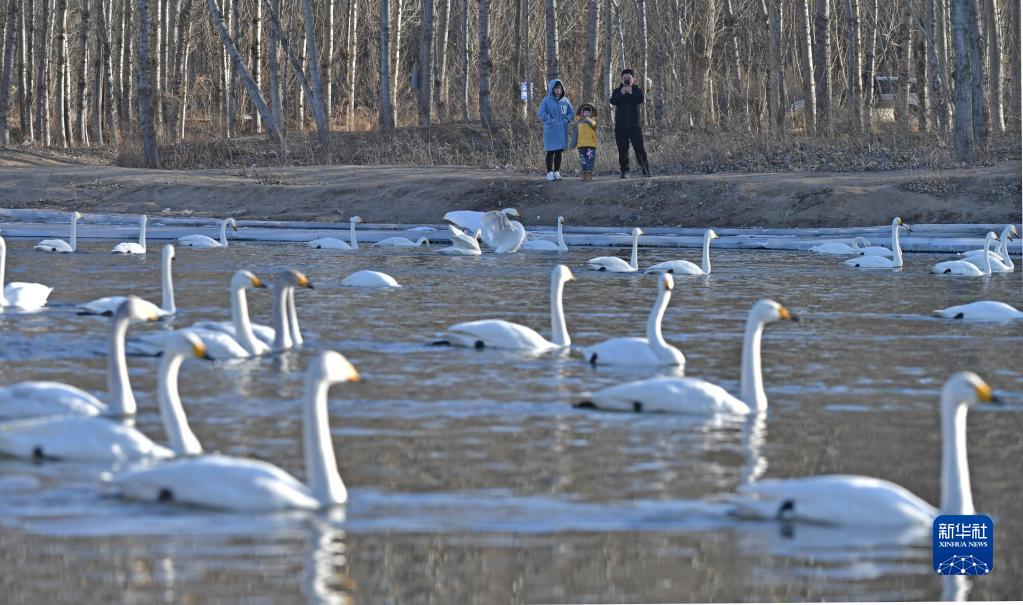 2月21日,游客在北票市八家子鄉紅村大凌河畔觀(guān)賞天鵝。