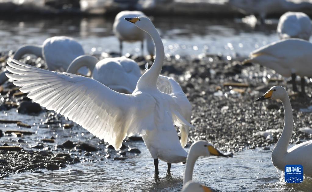 入冬以來(lái),遼寧省北票市八家子鄉紅村大凌河畔的400多只白天鵝在河水淺灘處嬉戲覓食,吸引人們前來(lái)觀(guān)賞和拍照。