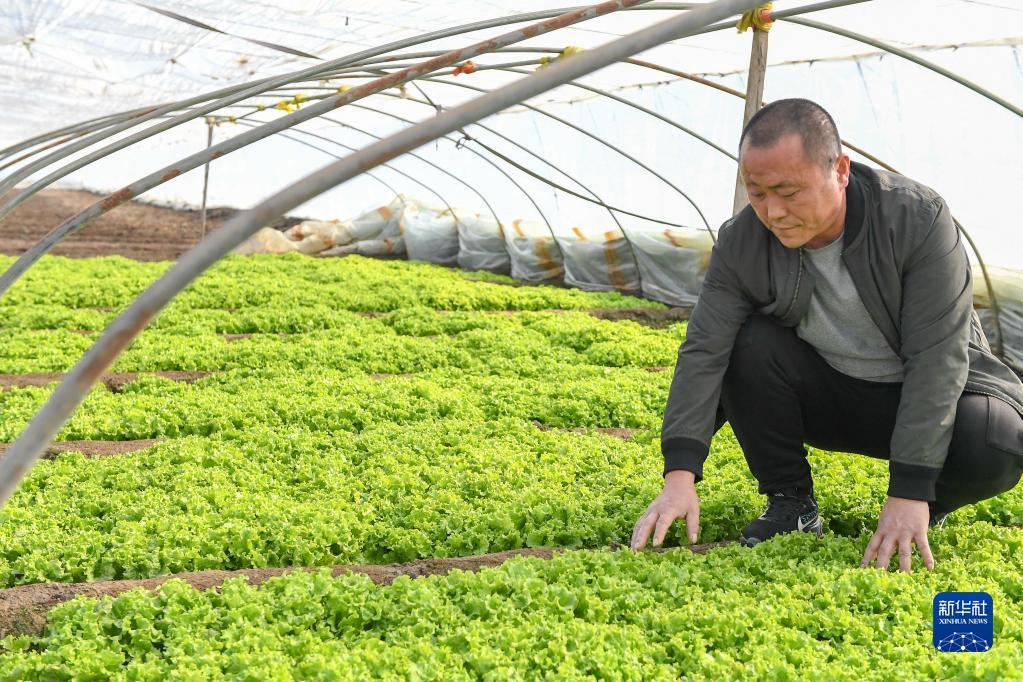 2月22日,農民李剛在吉林市永吉縣北大湖鎮五里河村查看蔬菜長(cháng)勢。