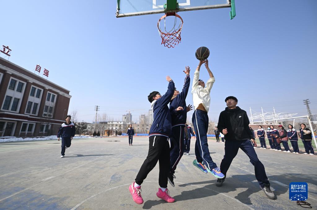 2月23日,西寧果洛中學(xué)學(xué)生在體育課上打籃球。
