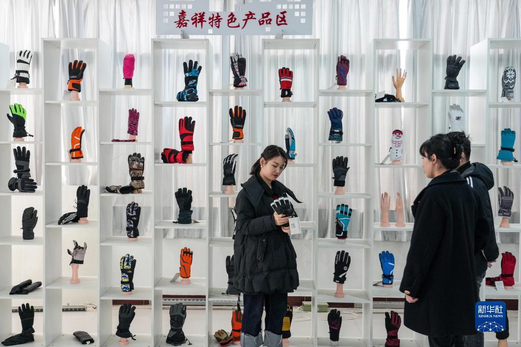 2月23日,在嘉祥縣的一家手套生產(chǎn)企業(yè),員工向客戶(hù)介紹手套新品。