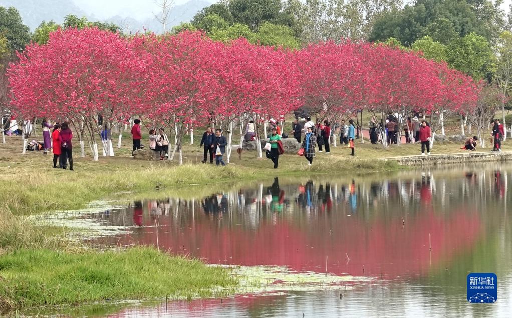 2月22日,游人在廣西賀州市愛(ài)蓮湖公園觀(guān)賞盛開(kāi)的桃花。