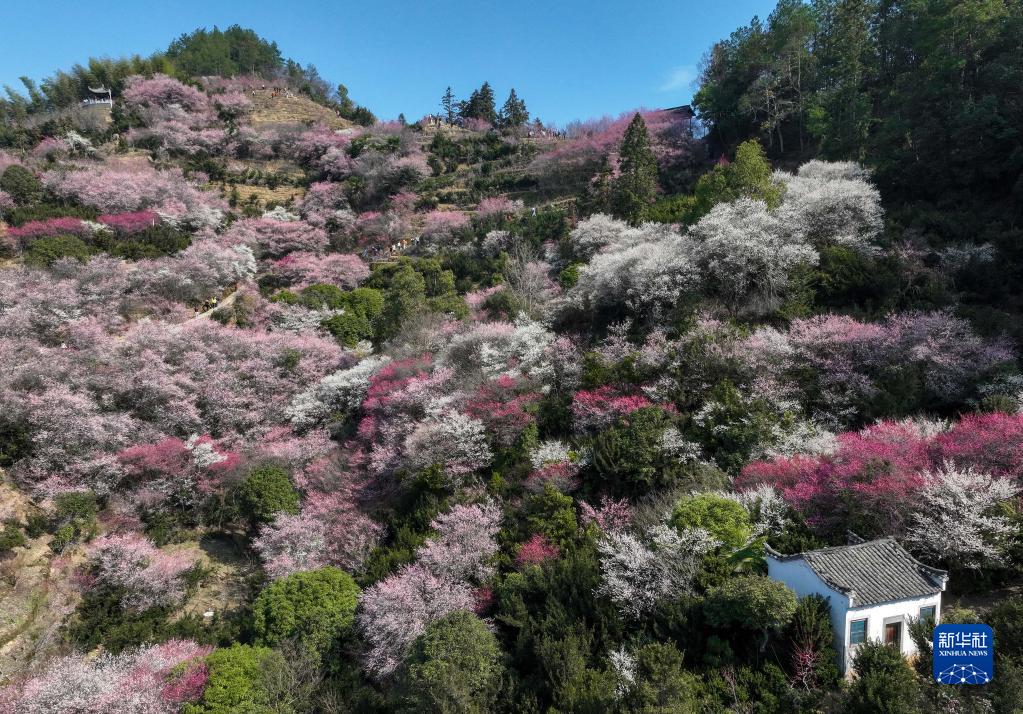 2月21日在安徽省黃山市歙縣賣(mài)花漁村拍攝的梅花(無(wú)人機拍攝)。