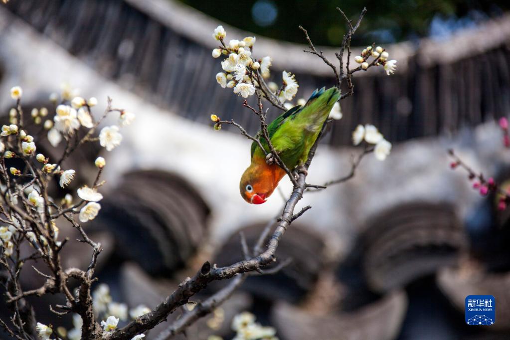 2月20日,一只小鳥(niǎo)落在南京梅花山的花枝上。