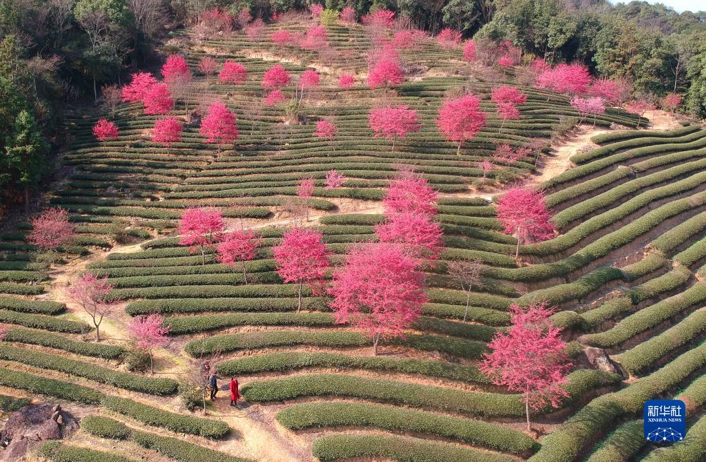 2月17日,游客在福建省南平市建陽(yáng)區將口鎮松柏村茶園中欣賞櫻花(無(wú)人機照片)。