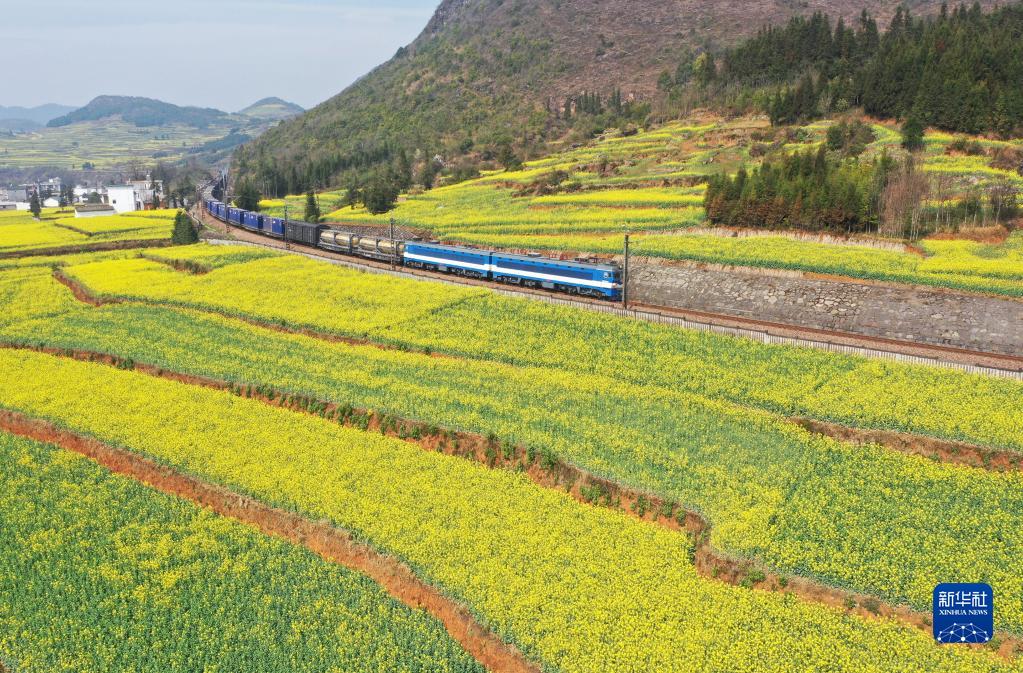 2月17日,一列火車(chē)駛過(guò)云南省羅平縣板橋鎮金雞村的油菜花田(無(wú)人機照片)。