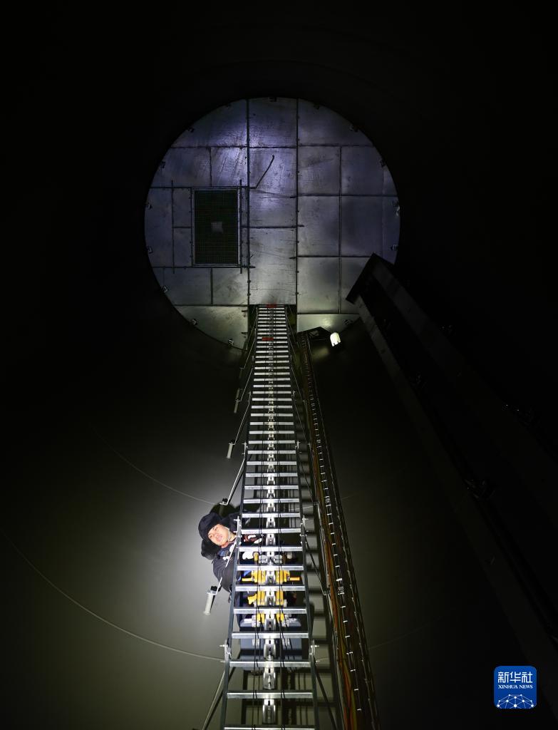 2月23日,工作人員在霍林河循環(huán)經(jīng)濟示范工程風(fēng)電光伏基地的風(fēng)電塔筒里作業(yè)。