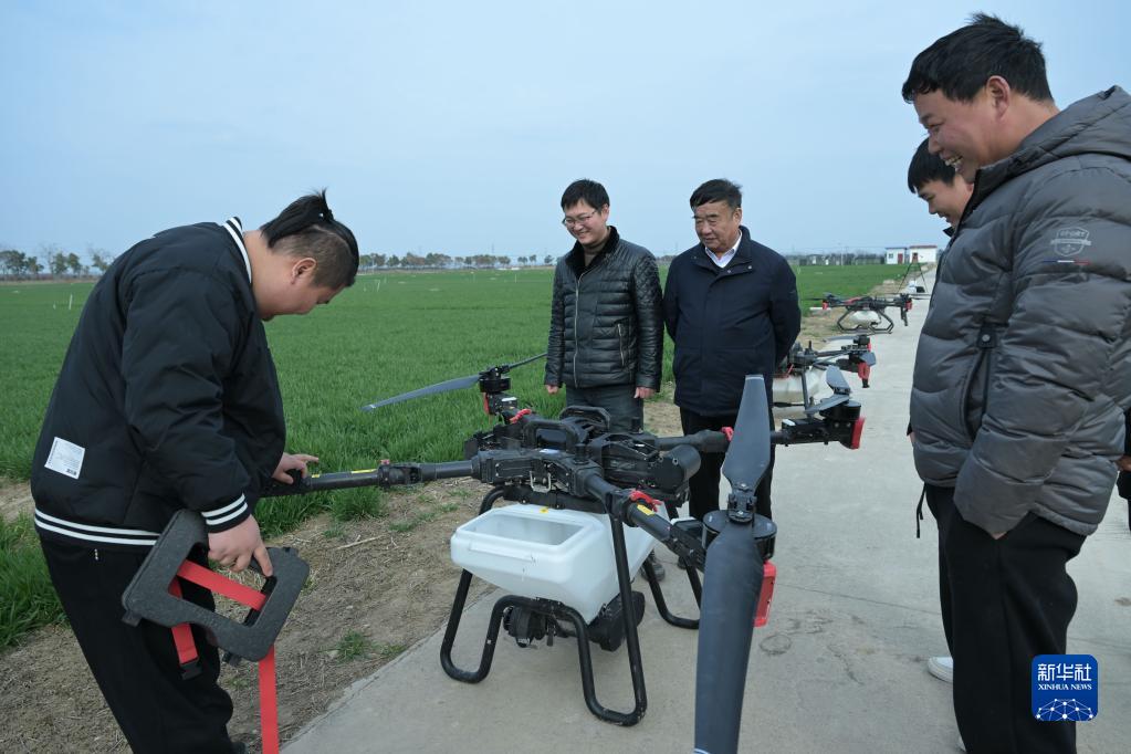 2月21日,在太和縣淙祥現代農業(yè)種植專(zhuān)業(yè)合作社,徐旭東(左二)和爺爺徐淙祥(左三)查看用于噴灑農藥的無(wú)人機。