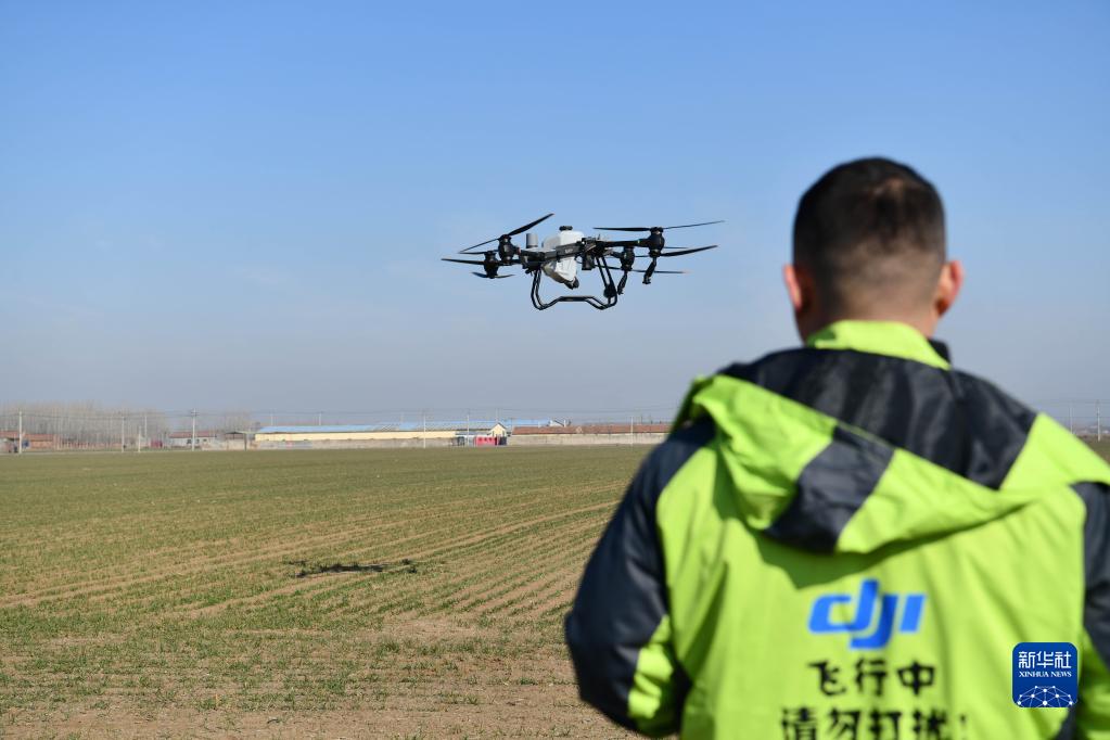 2月23日,在鄒平市長(cháng)山鎮八方農場(chǎng)活動(dòng)現場(chǎng),農機手進(jìn)行無(wú)人機智慧噴灑作業(yè)演示。